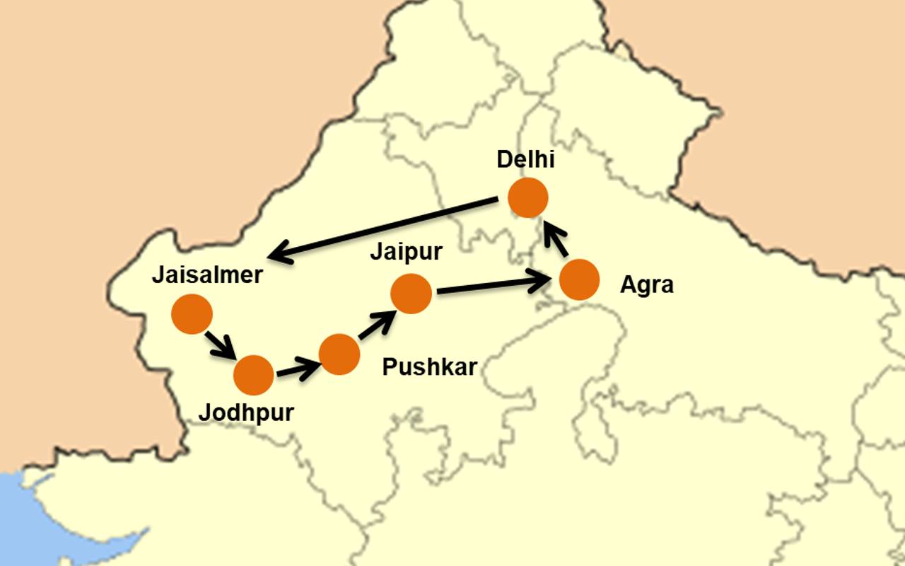 Delhi (1 bzw. 2 Nächte) – Jaisalmer (2 Nächte) – Jodhpur (2 Nächte) – Pushkar (1 Nacht) – Jaipur (2 Nächte) – Agra (1 Nacht) – Delhi (1 bzw. 2 Nächte)