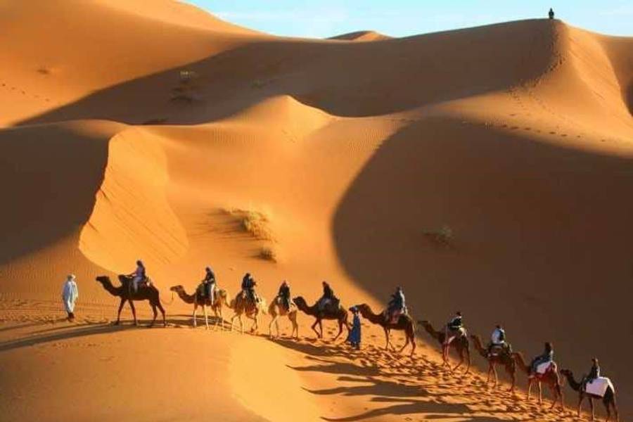 Am Nachmittag beginnt Ihr unvergessliches Wüstenabenteuer: Sie reiten auf Kamelen durch die Dünen und erleben den magischen Sonnenuntergang über der Sahara. Nach der Rückkehr ins Camp erwartet Sie ein traditionelles marokkanisches Abendessen unter dem Sternenhimmel.